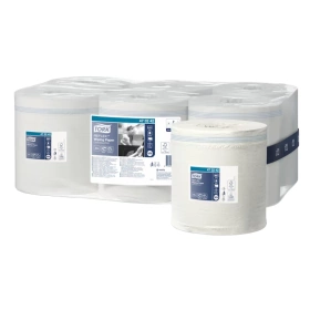 Wytrzymały i chłonny 1-warstwowy papier do czyszczenia powierzchni. Stosowany do ścierania płynów i wycierania rąk. Używany w dozownikach Tork Reflex systemu M4; ref: 473242