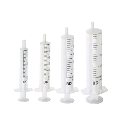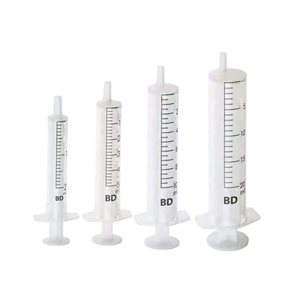 Strzykawka Discardit II Becton Dickinson dwuczęściowa o przezroczystym cylindrze z wyraźną miarką.