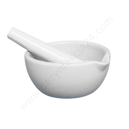 Duży moździerz porcelanowy z wylewem. Ma chropowate wnętrze i końcówką tłuczka ułatwiające mieszanie.