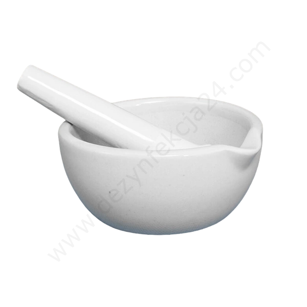 Duży moździerz porcelanowy z wylewem. Ma chropowate wnętrze i końcówką tłuczka ułatwiające mieszanie.