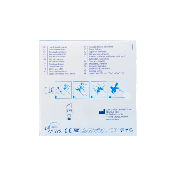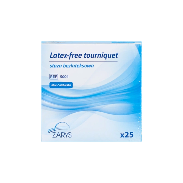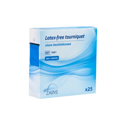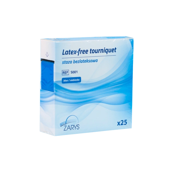 - Bezlateksowa staza uciskowa. W opakowaniu znajduje się 25 zrywanych kawałków stazy.