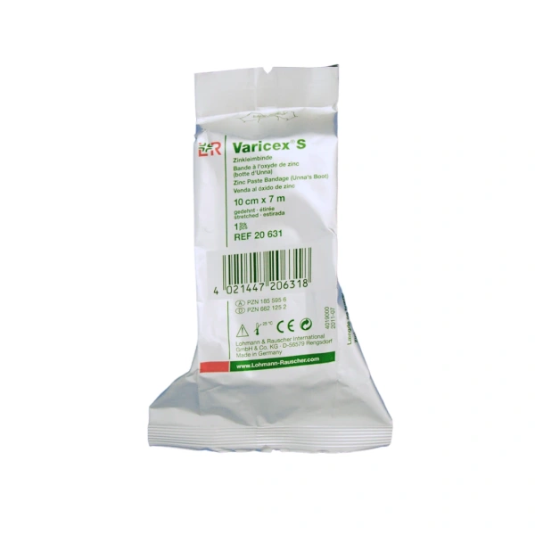 Varicex S to opaska dziana, elastyczna, rozciągana zarówna wzdłuż, jak i wszerz; z pastą cynkową.