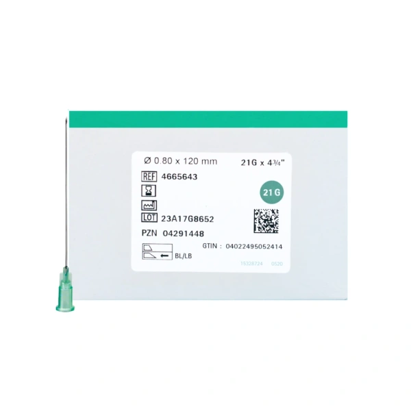 Igły iniekcyjne Sterican firmy BBraun 21G 0,8 x 120 mm. REF: 4665643; opakowanie 100 sztuk.
