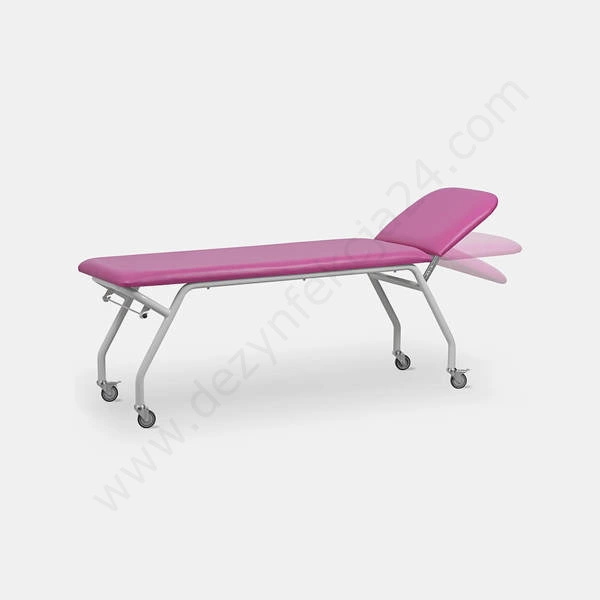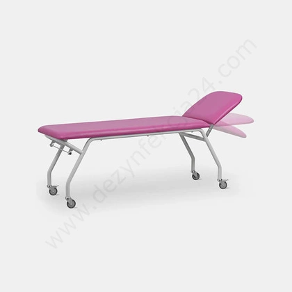 • Kozetka z kołami i stalową ramą oraz regulowanym zagłówkiem (kąt od - 30 do +45°) za pomocą rastomatów. Nieskładalna.