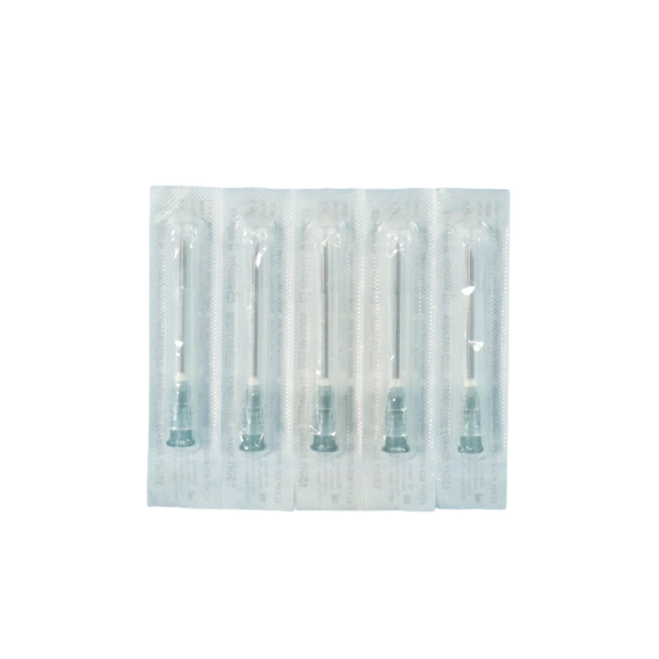 - Jałowa igła iniekcyjna. Nasadka koloru niebieskoszarego.