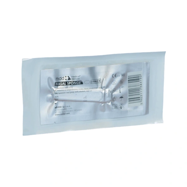Nasal Sponge to jednorazowy opatrunek wykonany z rozszerzalnej gąbki poliwinylowej z powłoką z gazy hemostatycznej i sznurka ułatwiającego usunięcie tamponu.