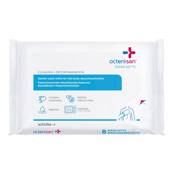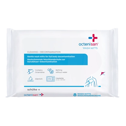 • Rękawiczki nasączone antybakteryjną emulsją Octenisan przeznaczone do mycia ciała.