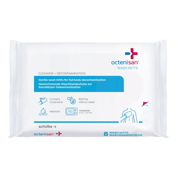 - Rękawiczki nasączone antybakteryjną emulsją Octenisan przeznaczone do mycia ciała.