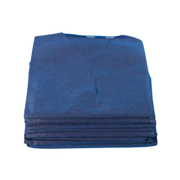 Koszula dla pacjenta z włókniny o uniwersalnym rozmiarze w kolorze niebieskim. Konstrukcja zakładana przez głowę z szerokimi otworami, które ułatwiają ubieranie.