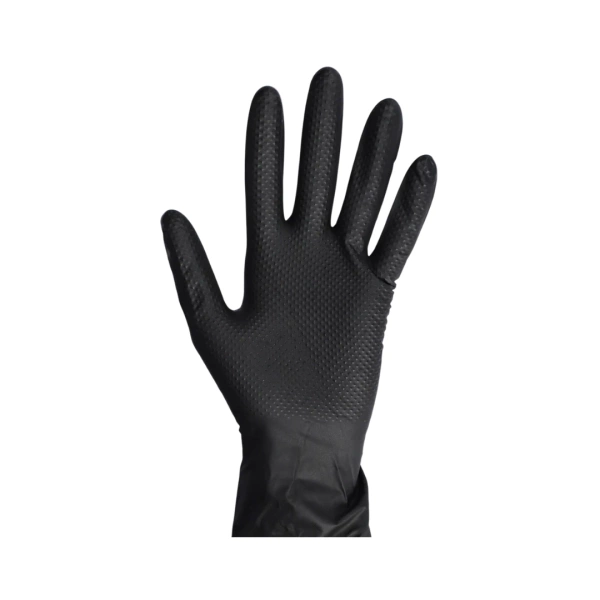 - Ochronne rękawice nitrylowe bezpudrowe czarne z teksturą o strukturze diamentu.