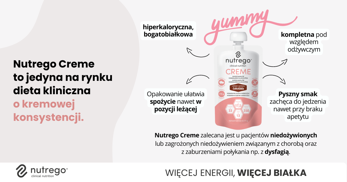 Nutrego CREME dzięki zwiększonej zawartości protein i wysokiej kaloryczności pomaga pacjentom, którzy potrzebują więcej energii lub białka z powodu choroby (choroby przewodu pokarmowego, choroby onkologiczne lub dla zdrowia przed/po operacji). Optymalny skład i opakowanie sprawiają, że jest to odpowiedni suplement dla niedożywionych seniorów. Nie zawiera glutenu ani laktozy, dlatego nadaje się przy nietolerancji laktozy i celiakii.