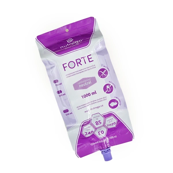 Nutrego FORTE 1000 ml, zawiera 2000 kcal, jest to kompletna pod względem odżywczym hiperkaloryczna i wysokobiałkowa dieta do żywienia dojelitowego. Zawiera niezbędną dobową porcję wszystkich składników odżywczych, w tym witamin i mikroelementów. Do postępowania dietetycznego u pacjentów niedożywionych lub zagrożonych niedożywieniem związanym z chorobą.