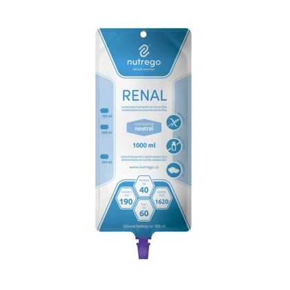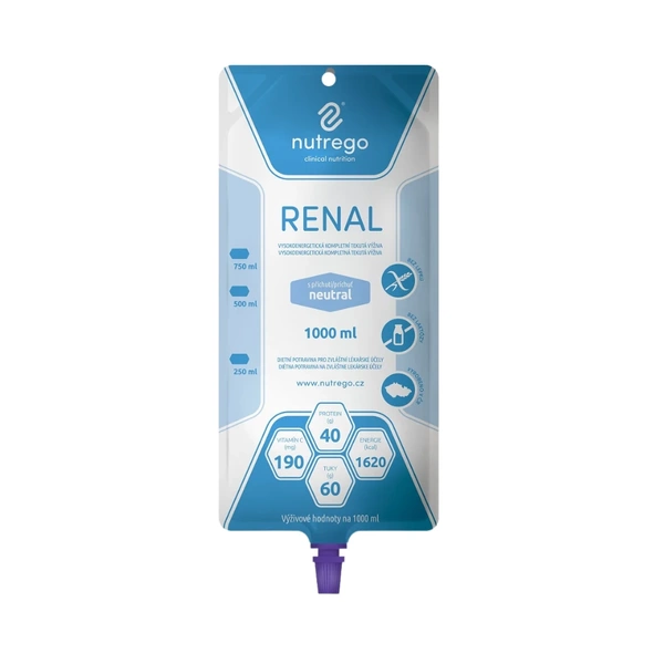 Nutrego RENAL to kompletna pod względem odżywczym dieta hiperkaloryczne z dostosowanymi ilościami białek i elektrolitów (fosfor, potas, sód) przeznaczone do podawania przez zgłębnik do żywienia dojelitowego. Zalecany dla pacjentów niedożywionych lub zagrożonych niedożywieniem w przewlekłej lub ostrej chorobie nerek w okresie przeddializacyjnym. Nutrego RENAL może być również stosowany u pacjentów z nadciśnieniem tętniczym ze względu na niską zawartość sodu. Nie zawiera glutenu ani laktozy, dlatego nadaje się przy nietolerancji laktozy i celiakii.
