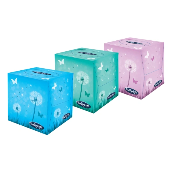 Ekstra miękkie chusteczki higieniczne Bulkysoft z delikatnego, miękkiego i chłonnego materiału opakowane są w estetyczny kartonik.