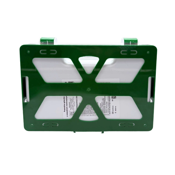 Apteczka z montażem do uchwytu (ściennego lub na innych powierzchniach). Konstrukcja pozwala na szybkie wypięcie całej apteczki z uchwytu i zaniesienie na miejsce zdarzenia.